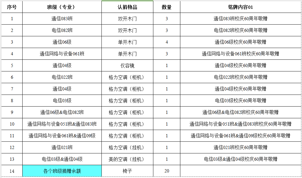 此次捐赠的办公设施包括空调8台、办公室双开木门6扇、单开木门7扇、椅子20个、仪容镜1面等,价值近68000元。校友们表示,母校是自己成长的摇篮,老师和同学们给予了自己无尽的关怀和帮助,他们始终铭记母校的恩情与培养,希望通过此次捐赠为学院教学环境改善贡献一份力量,祝愿学校发展越来越好,桃李芬芳满天下。